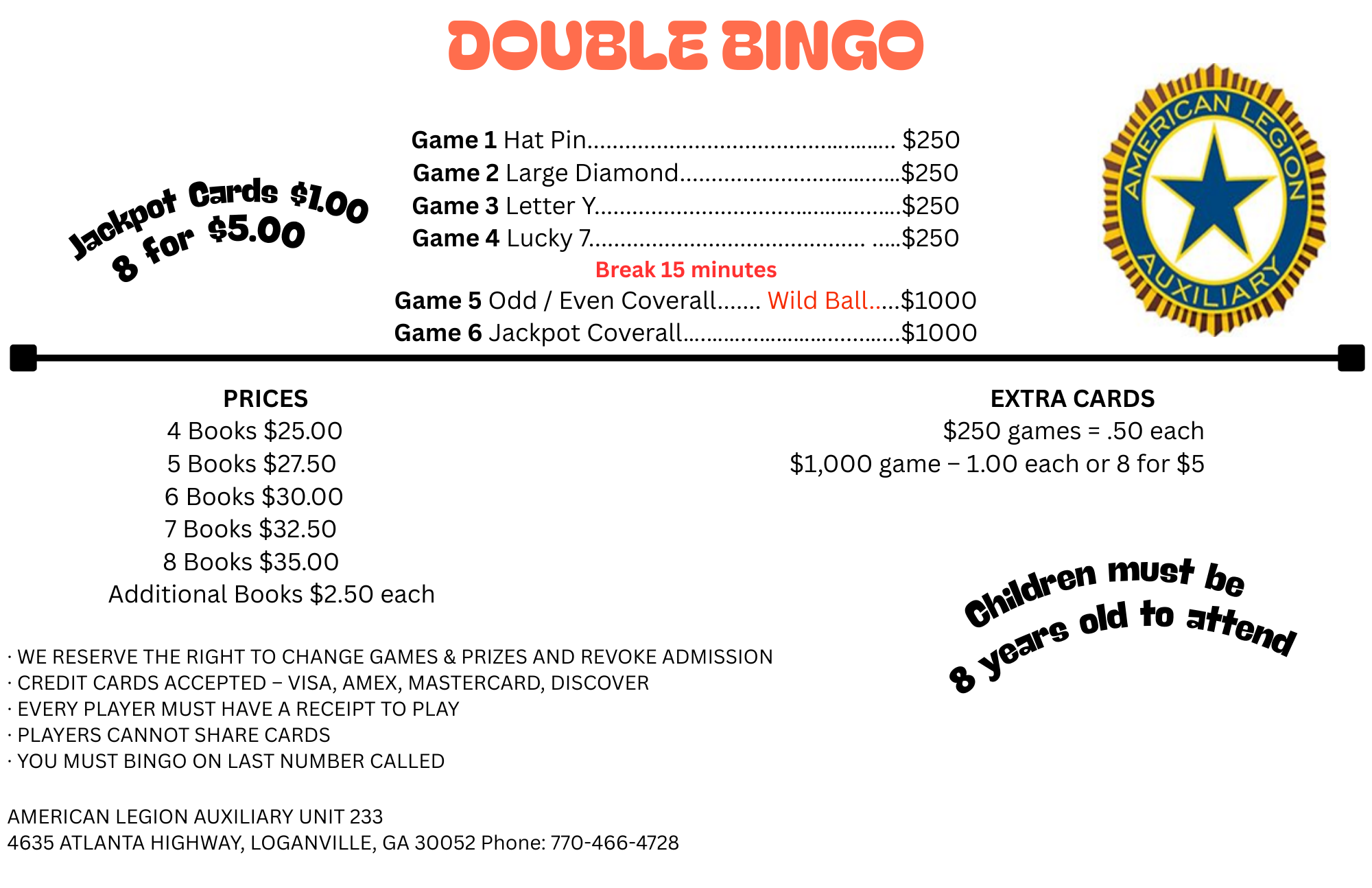 Doors OPEN at Noon, Raffle Games start at 1:00 pm, BINGO starts at 2:00 pm