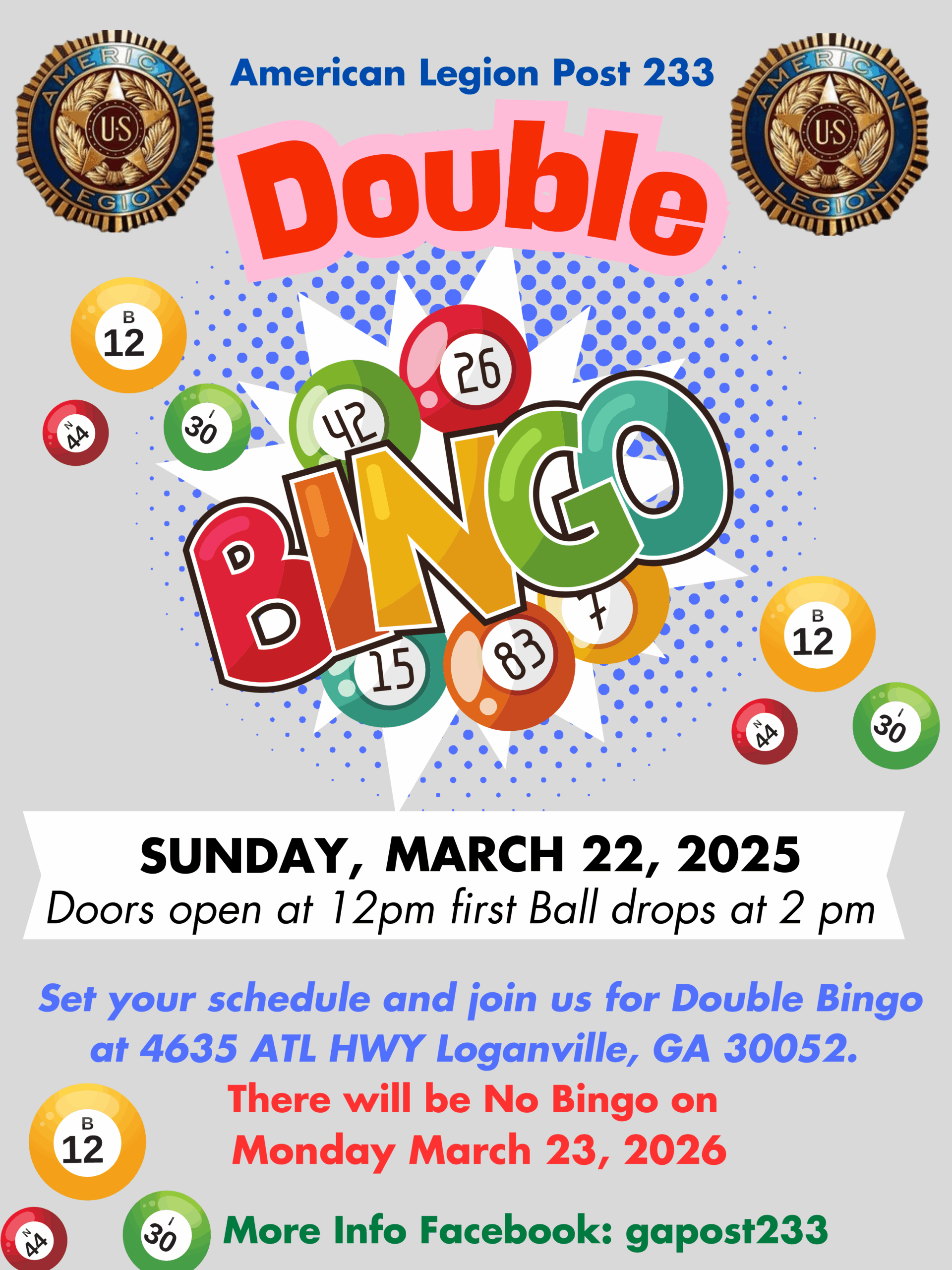 Doors OPEN at Noon, Raffle Games start at 1:00 pm, BINGO starts at 2:00 pm We reserve the Right to change Games & Prizes and Revoke Admission Credit Cards Accepted * Visa * Mastercard * Discover EVERY PLAYER MUST HAVE A RECEIPT - PLAYERS CANNOT SHARE CARDS Hosted by the American Legion Auxiliary Unit #233 … Continue reading Sunday BINGO